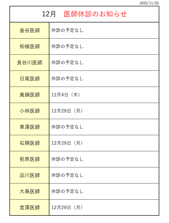 > 【12月】医師休診のご案内を掲載しました。【11月20日版】